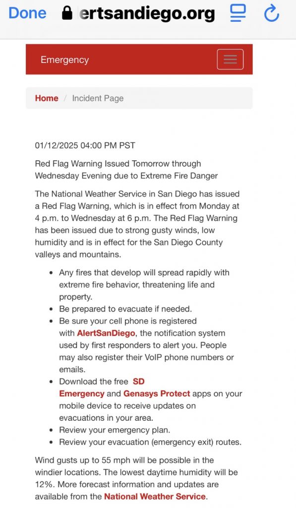 Here in San Diego, we have been under a Red Flag Warning (fire alert) for most of the time since the LA fires started. Here’s the latest from Alert San Diego on that.